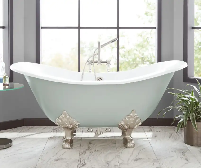 This double “slipper tub” with adjustable lion’s foot feet is the ultimate in elegance and is perfect for bathing two people. It has a high back for comfortable bathing. The manufacturer offers a glossy finish that will stay shiny for years to come. Thicker than most bathtubs, it retains heat for a long time, making it welcome after a hard day on your feet.