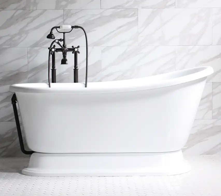 Abbott’s 59-inch double-sided acrylic bathtub combines modern and classic design with streamlined cast aluminum legs.