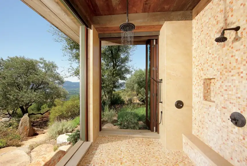Here’s an example of an outdoor shower with an interesting floor. The shower design uses the same color as the outside of the house, but the floor is cobblestone to highlight the shower space. This provides a natural connection to the outside landscape. An opening door allows for quick access to the house after the shower.