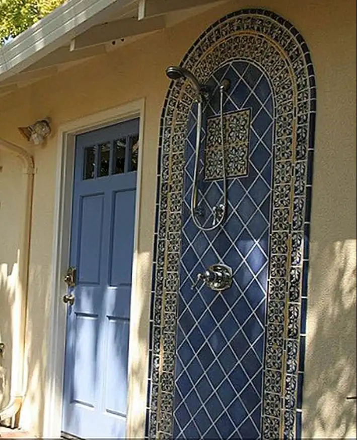 The beauty of outdoor showers is that you effortlessly decorate them with natural scenery. In a gorgeous outdoor shower, curly vines climb the blue walls. Sliding glass doors connect this outdoor space to an enclosed tub, protecting your privacy both inside and out.