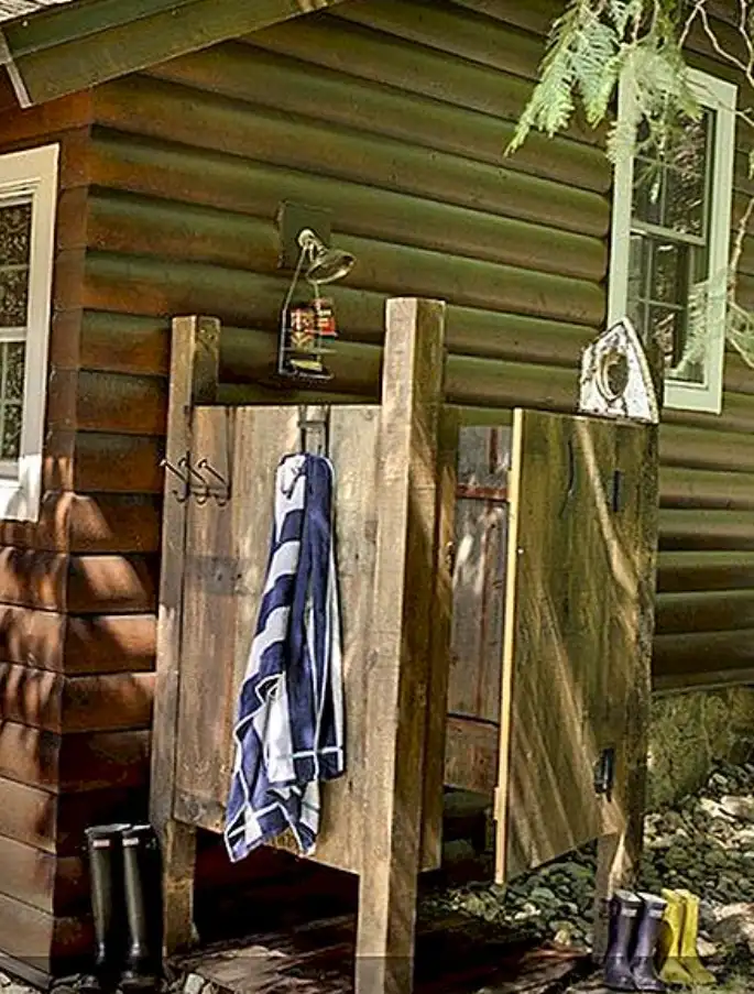 The cabins are definitely more comfortable than the campgrounds, but you can add an outdoor hiking shower to give them a hiking look. This fun rustic outdoor shower has wooden scrubs, towel hooks and showerheads. It can also easily be used as an extra shower if extra guests arrive for the weekend.